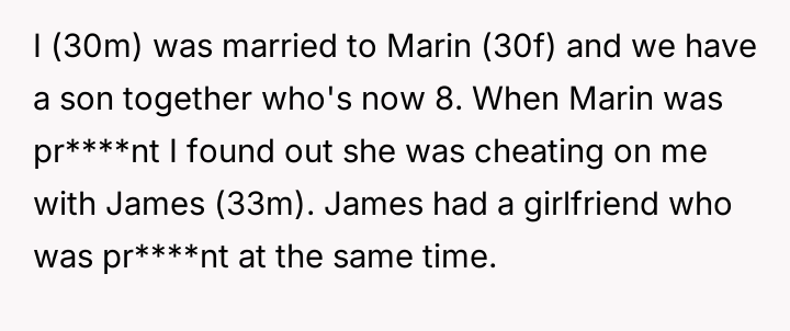 The narrator, a 30-year-old male, was married to Marin (30f) and they had a son. During the pregnancy, the narrator discovered Marin was cheating with James (33m), who also had a pr****nt girlfriend.