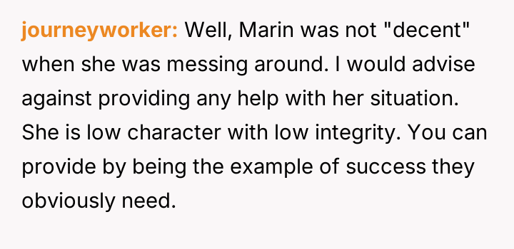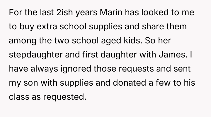 Recently, Marin approached the narrator asking him to purchase school supplies for her two daughters with James, which led to a heated confrontation where the narrator refused, questioning his responsibility to those children. The narrator now wonders if his firm refusal and harsh words were justified.