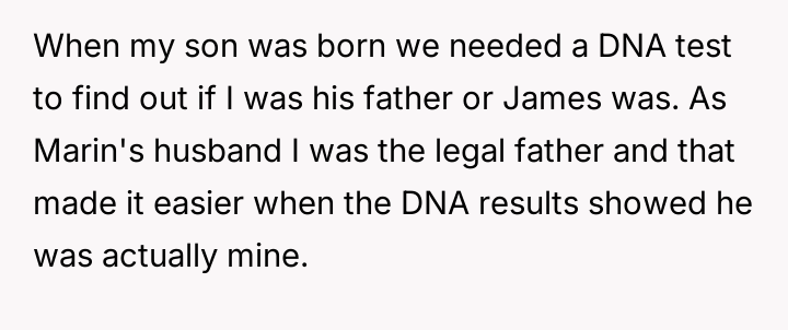 Following the son's birth, a DNA test confirmed the narrator was the father, despite Marin wanting James listed.