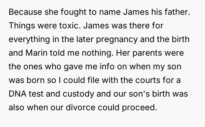 This period was marked by high tension, as James was present for the birth while the narrator received updates from Marin's parents, leading directly into divorce proceedings and custody action.