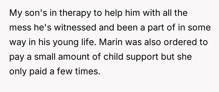 Currently, Marin has limited visitation, and she has a history of failing to pay court-ordered child support.