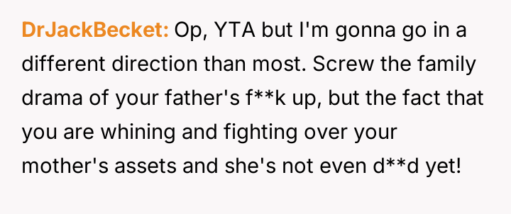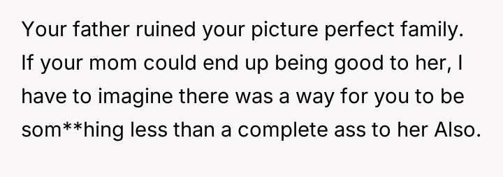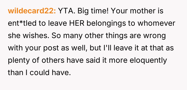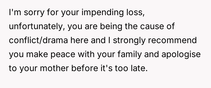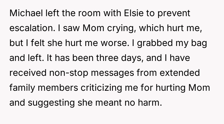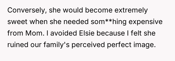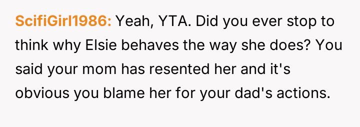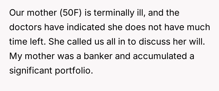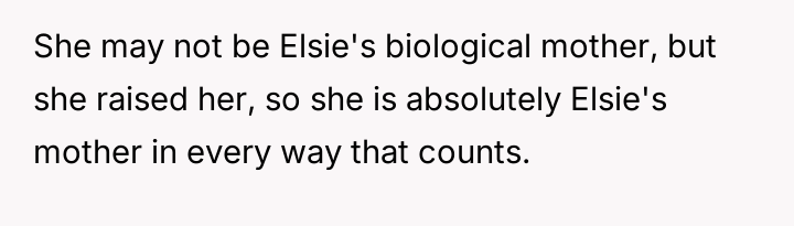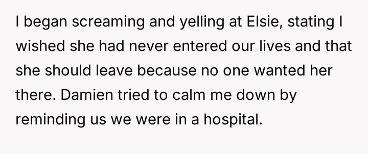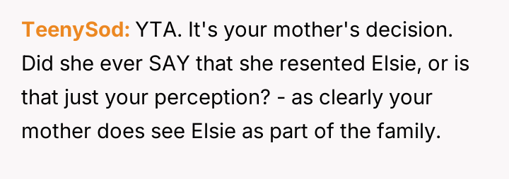 Given the mother's terminal condition and her choice to acknowledge Elsie in this manner, is the OP's explosive reaction justified by their lifelong feeling of displacement and resentment towards Elsie, or was this public outburst an unacceptable way to confront the mother's final wishes regarding the family's assets?