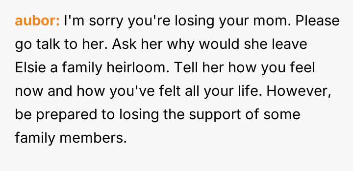 The original poster (OP) reacted with intense emotional distress and anger upon learning that their terminally ill mother intended to leave a significant family heirloom, an emerald necklace, to their half-sister, Elsie.