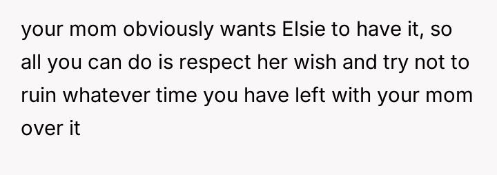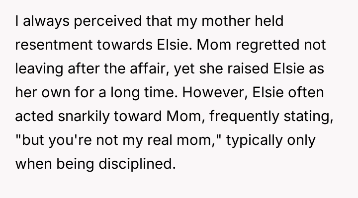 The central conflict lies in the OP's deep-seated belief that Elsie, due to her parentage resulting from an affair, does not deserve an equal share or connection to the family legacy, which clashes directly with the mother's final act of apparent inclusion and forgiveness.
