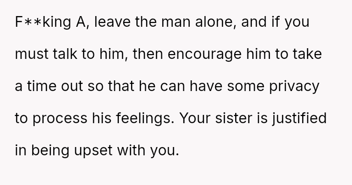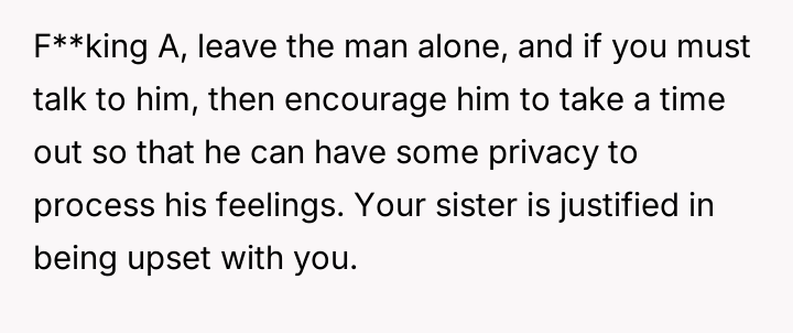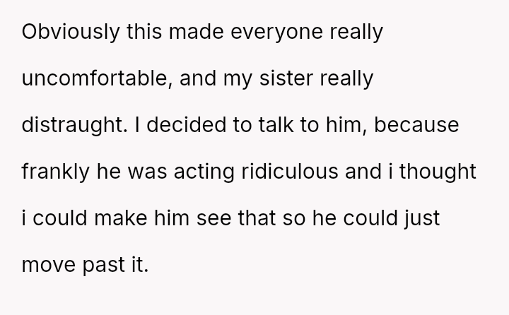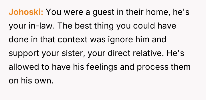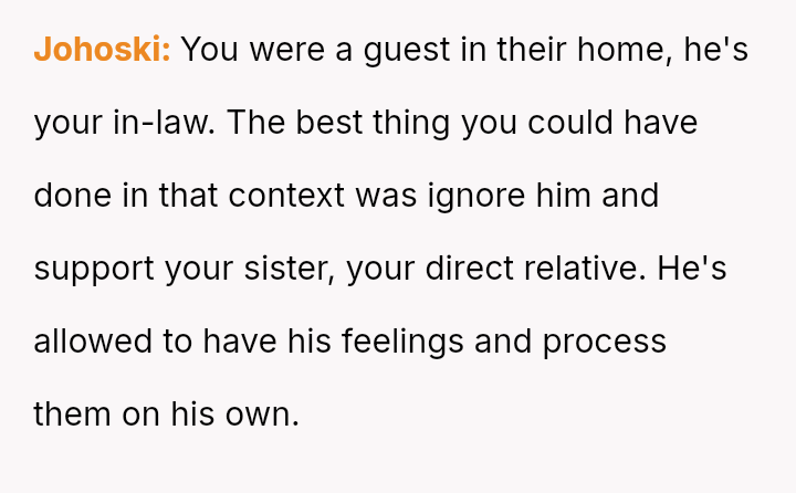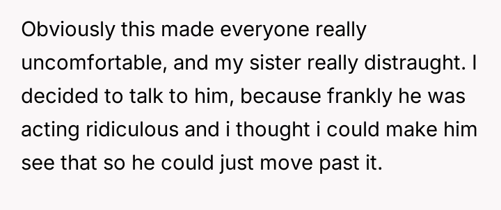 The central conflict arises from the OP's direct confrontation of the brother-in-law's reaction versus the sister's subsequent anger toward the OP for escalating the tension by challenging his behavior.