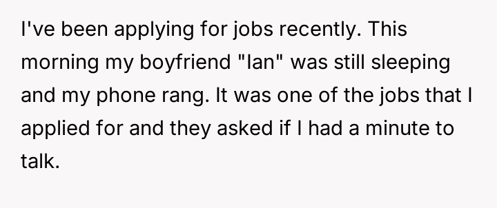 The original poster (OP) felt highly frustrated and disrespected because her boyfriend, Ian, repeatedly interrupted a crucial, unplanned job phone screening, prioritizing his curiosity over her professional needs.