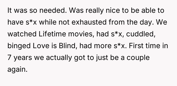 After seven years of relentless exhaustion and parenting demands, a couple finally carves out a rare weekend just for themselves—a fleeting chance to reconnect, to remember the intimacy and joy that once defined their relationship.