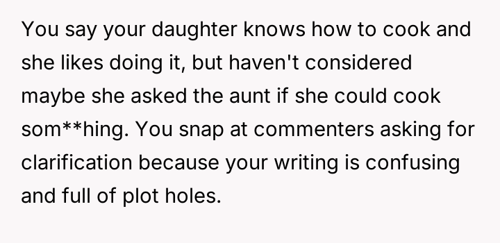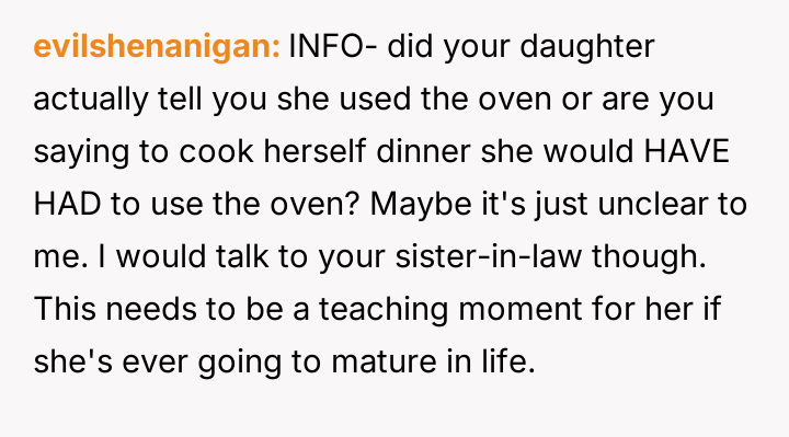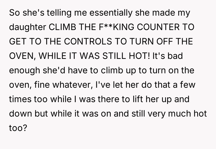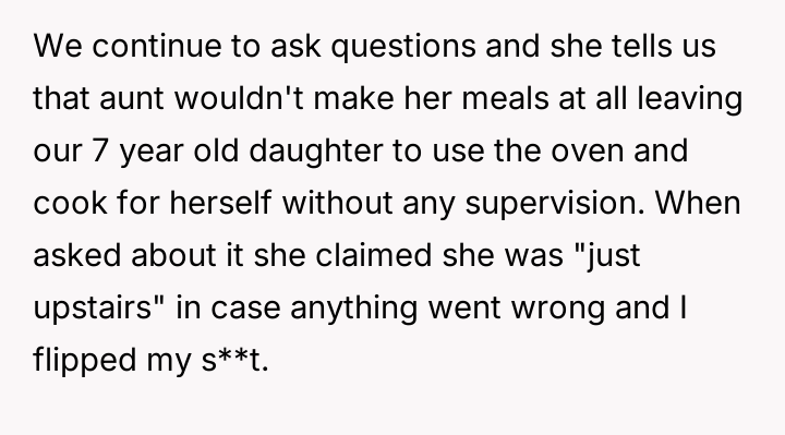 The original poster (OP) experienced a severe breach of trust and safety expectations after discovering their 17-year-old niece allegedly forced their 7-year-old daughter to cook unsupervised, including interacting with a hot oven.