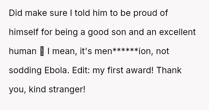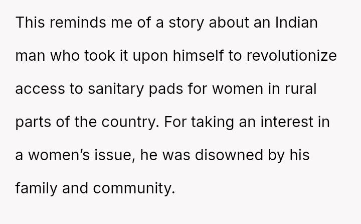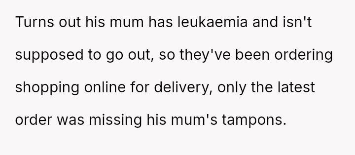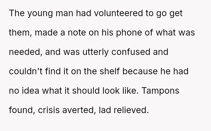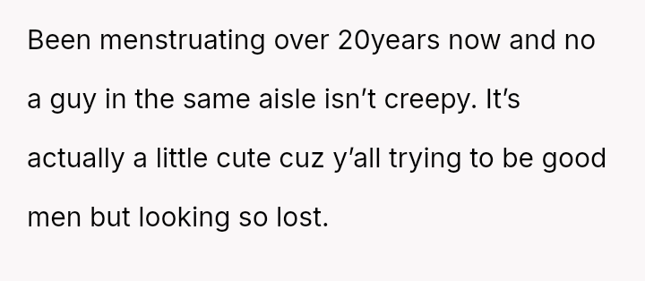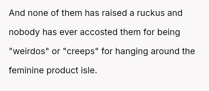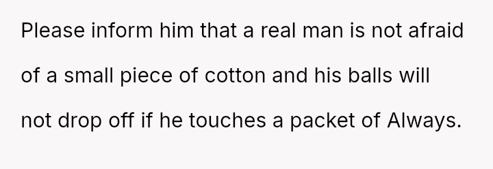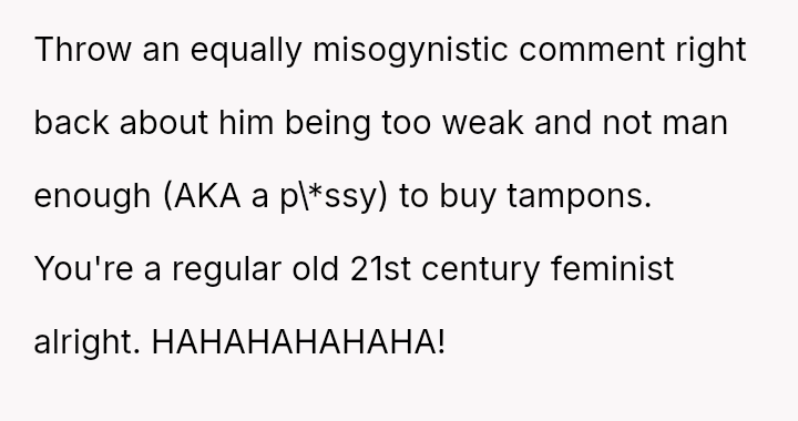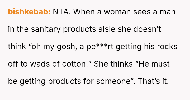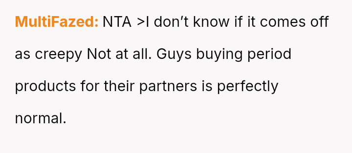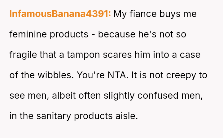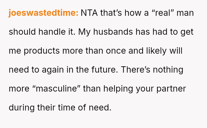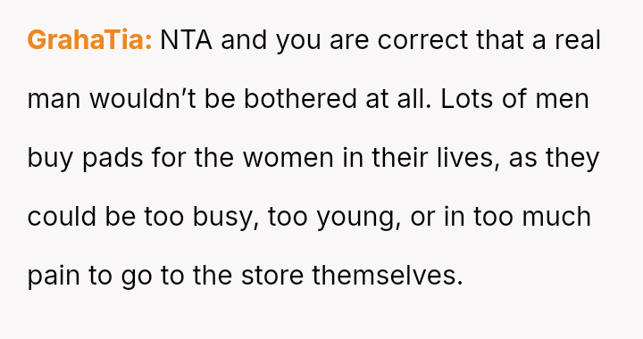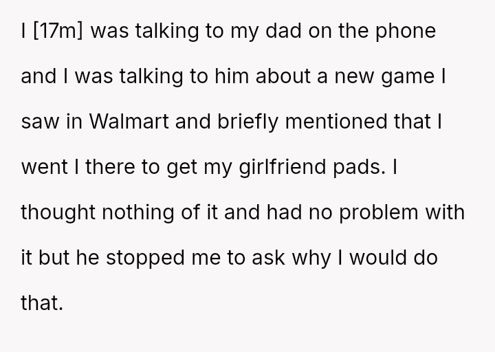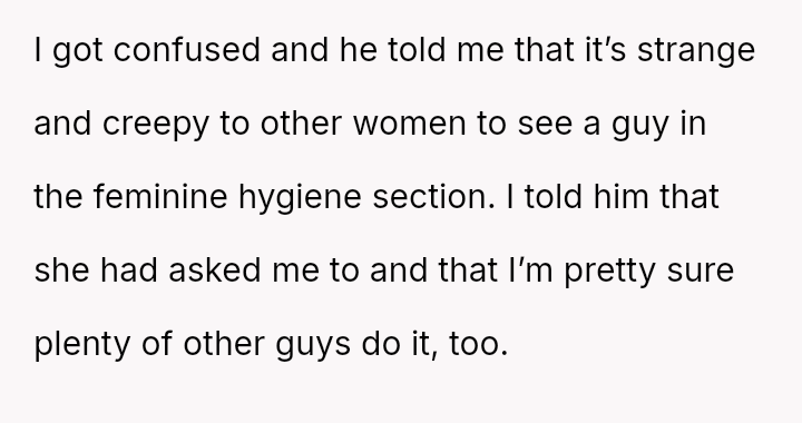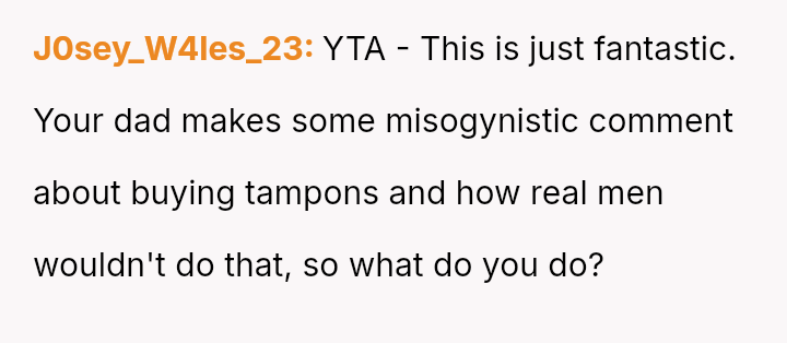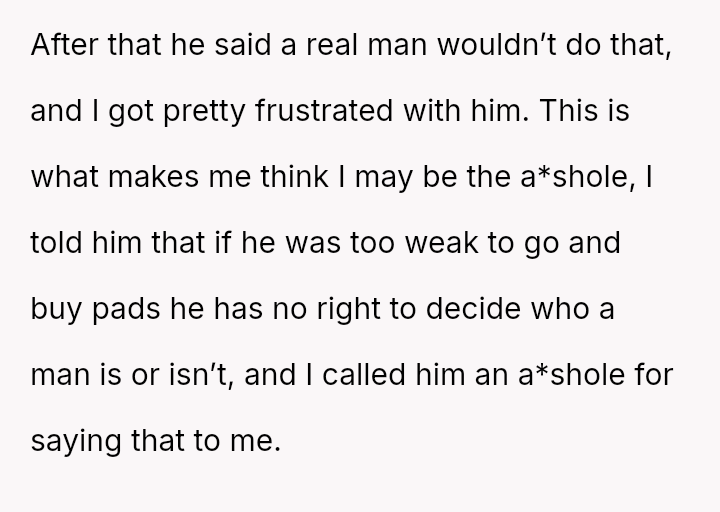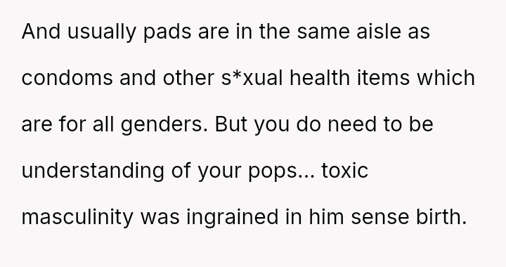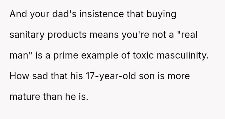 The original poster (OP) feels conflicted after standing up for his actions—buying menstrual products for his girlfriend—when his father criticized him, suggesting that such tasks are inappropriate for men.