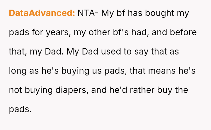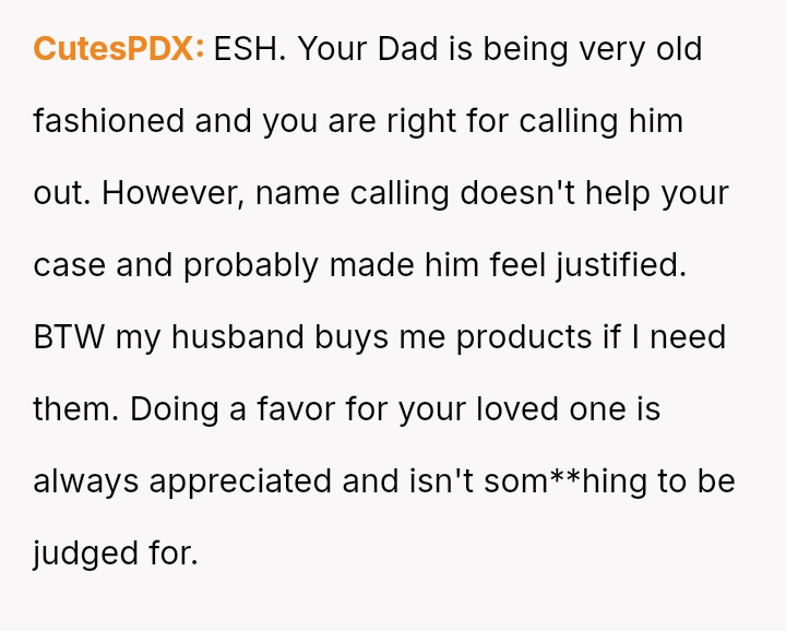 Is the OP correct in a*serting that supporting a partner with necessary purchases is simply being a good boyfriend, or does the father’s concern about societal perception raise a valid point regarding traditional gender roles and public perception? Where should the line be drawn between personal support and perceived social awkwardness?