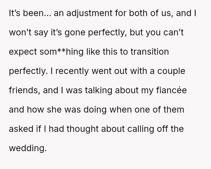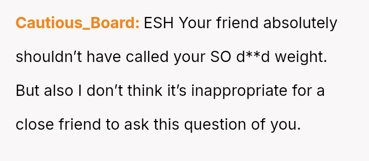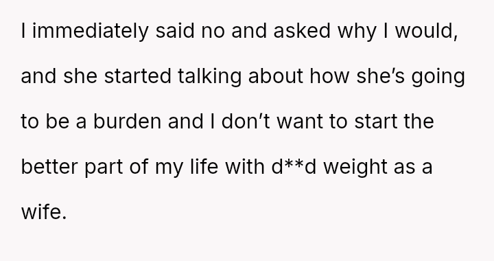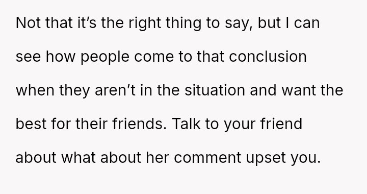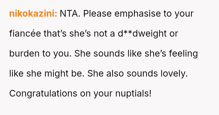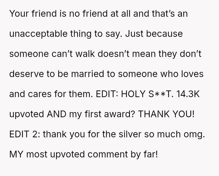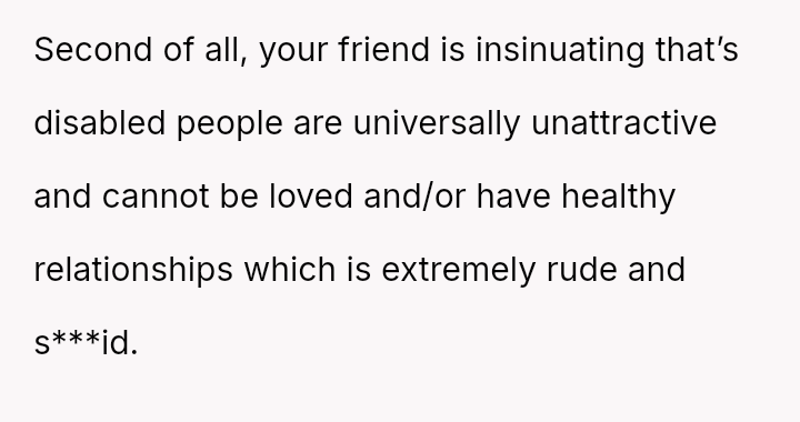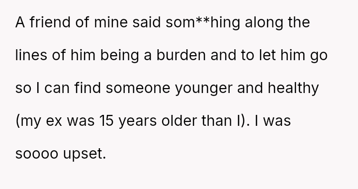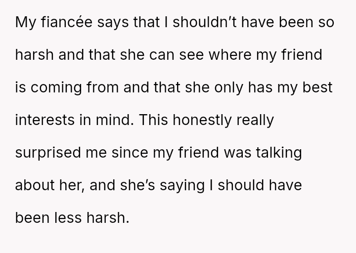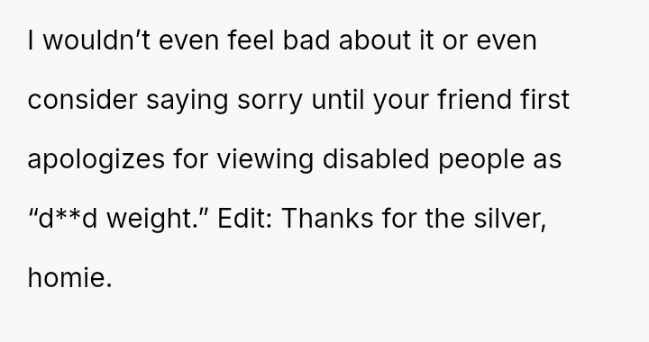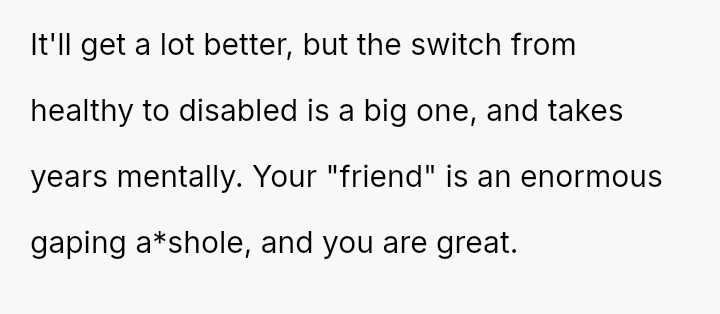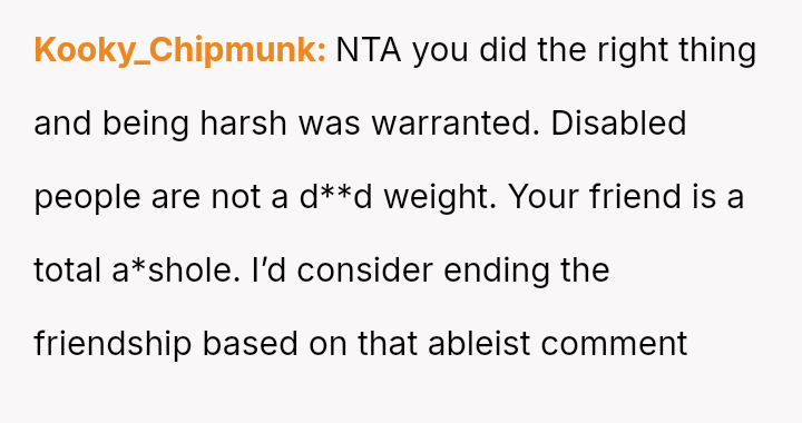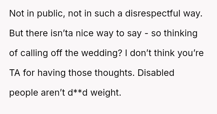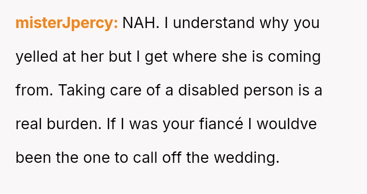 The OP became angry when a friend suggested the disability made the fiancée a 'burden' and reacted sharply, yet the fiancée later stated the OP was too harsh in their defense.