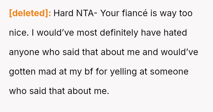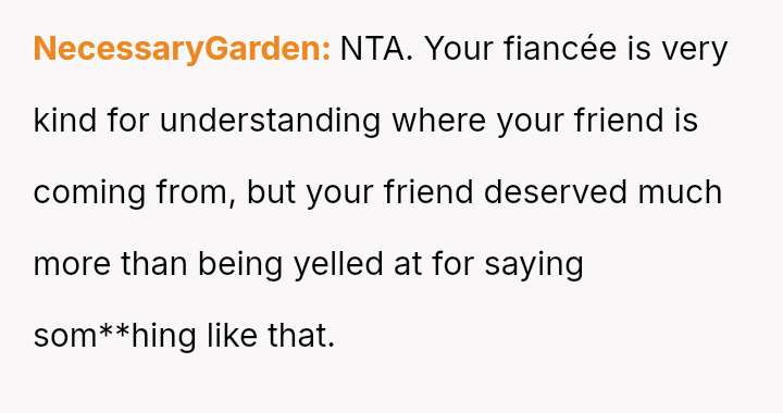 Was the OP's explosive defense of his fiancée, motivated by loyalty and anger over an insensitive comment, an overreaction that damaged his relationship, or was his forceful defense entirely justified given the nature of the friend's remark about his future wife?