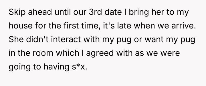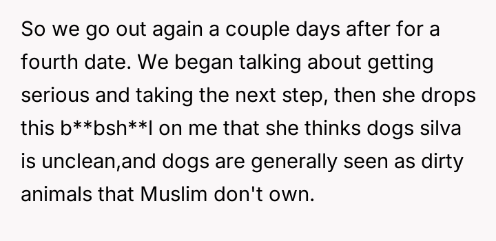 As they stand on the precipice of som**hing more serious, the revelation of her views on dogs shatters the illusion of compatibility.