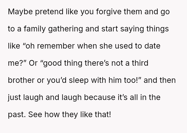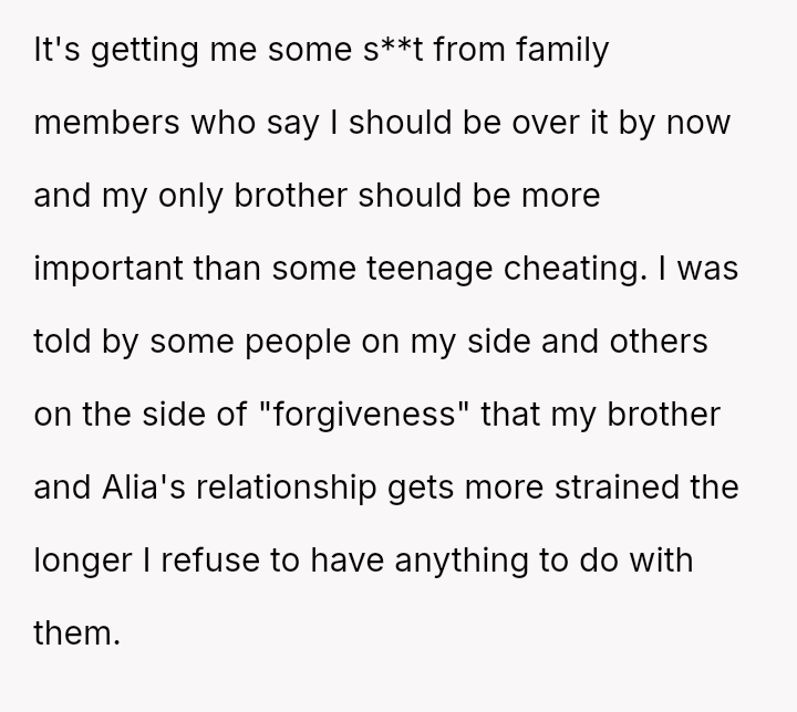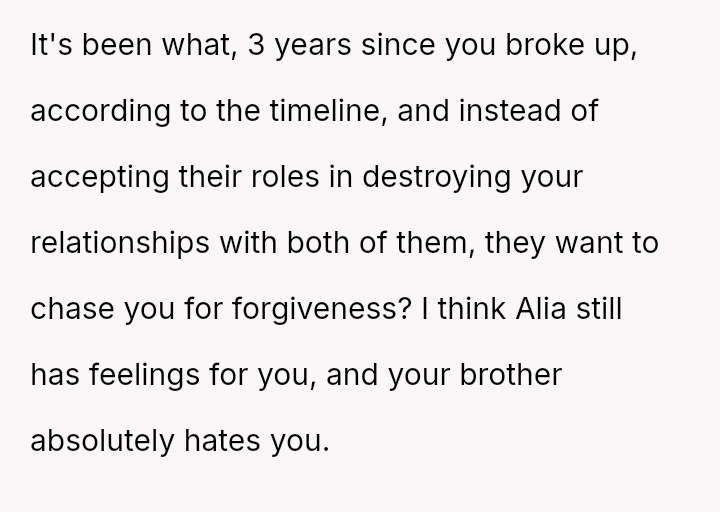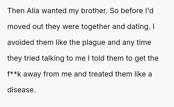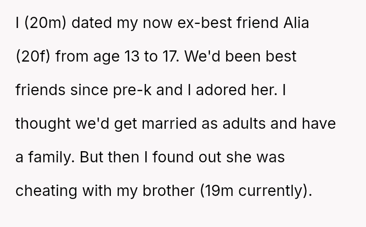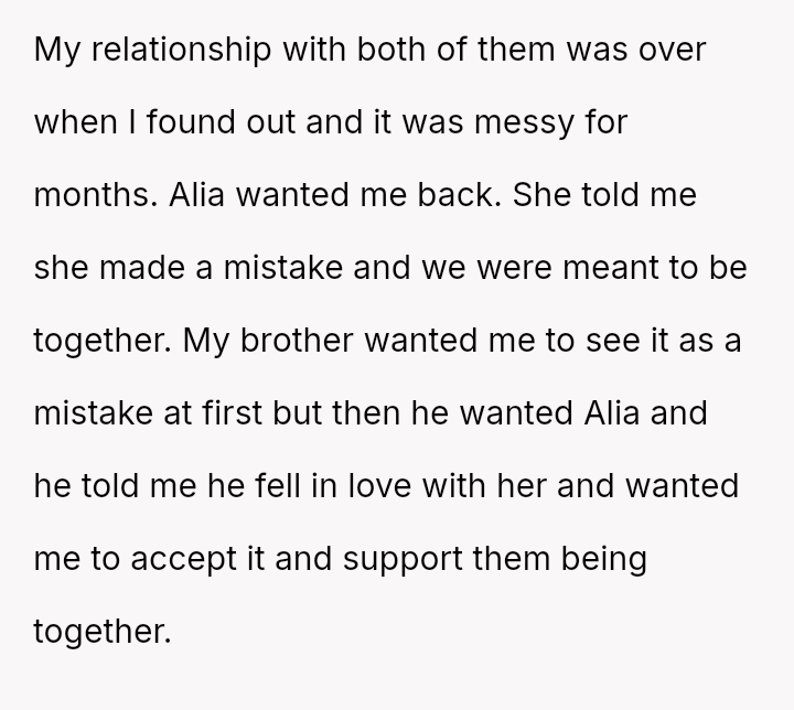 The original poster (OP) is dealing with the severe emotional fallout from being betrayed by his former girlfriend, Alia, who cheated with his brother and then quickly entered a relationship with him.
