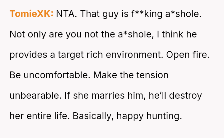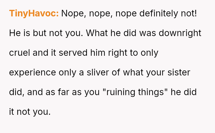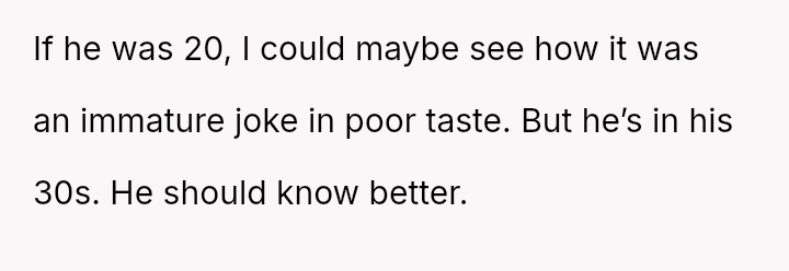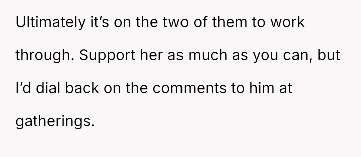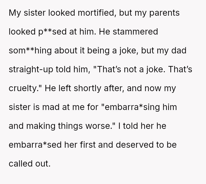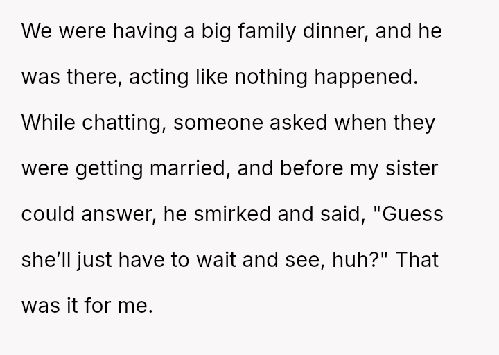 Although the sister did not end the relationship, she remained deeply hurt. Later, at a family dinner, the fiancé made another insensitive comment regarding their wedding plans.