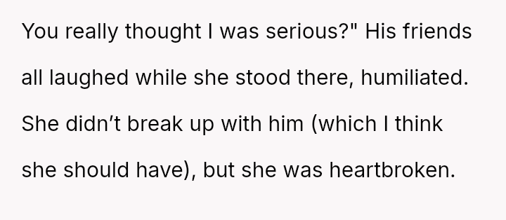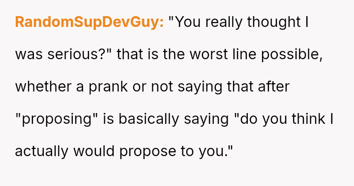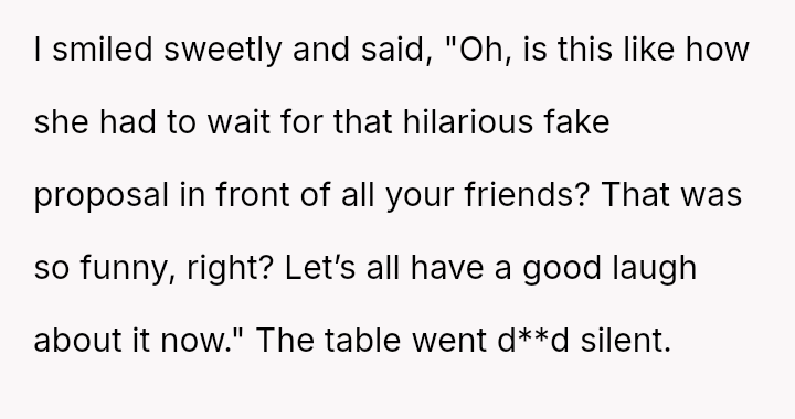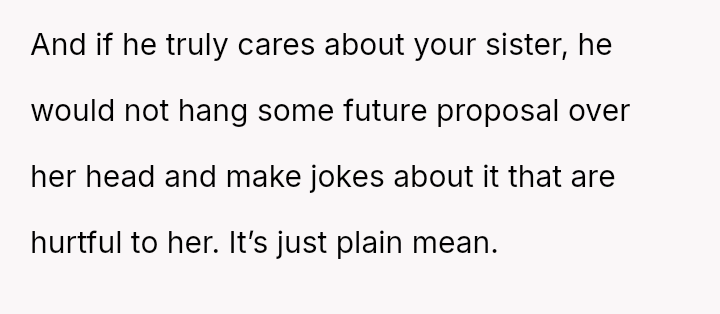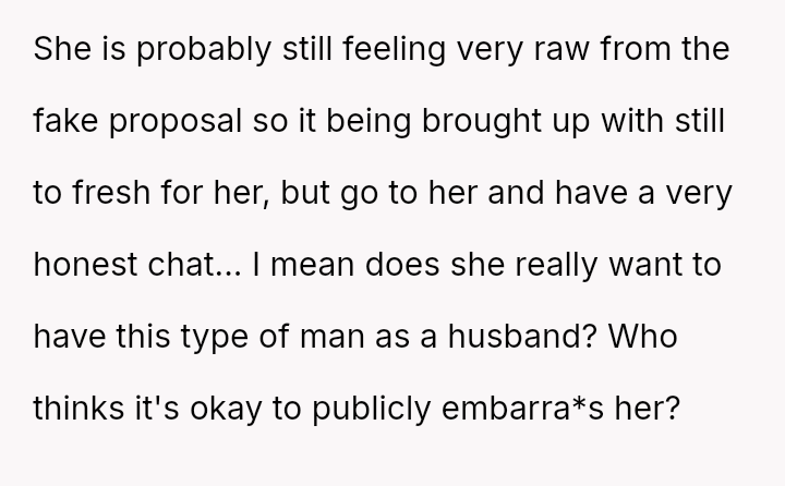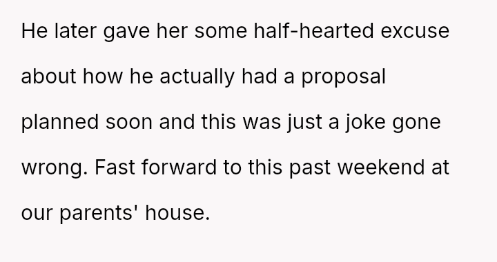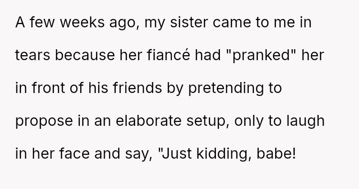 In response, the narrator brought up the previous fake proposal incident to call him out publicly, which led to an argument with the sister who felt embarra*sed by the confrontation. The narrator is now questioning if they were wrong for intervening.