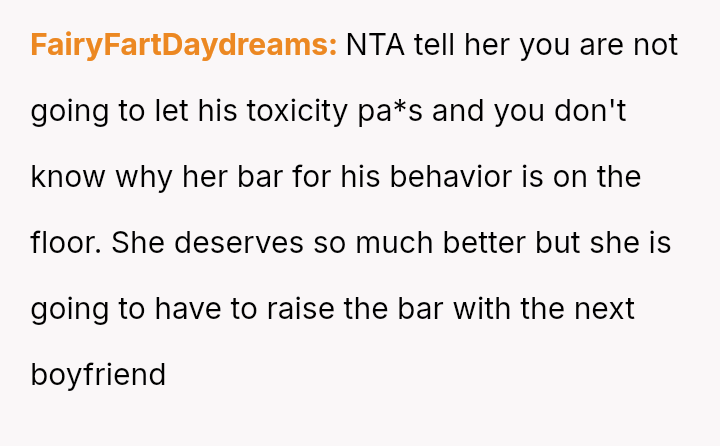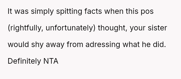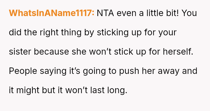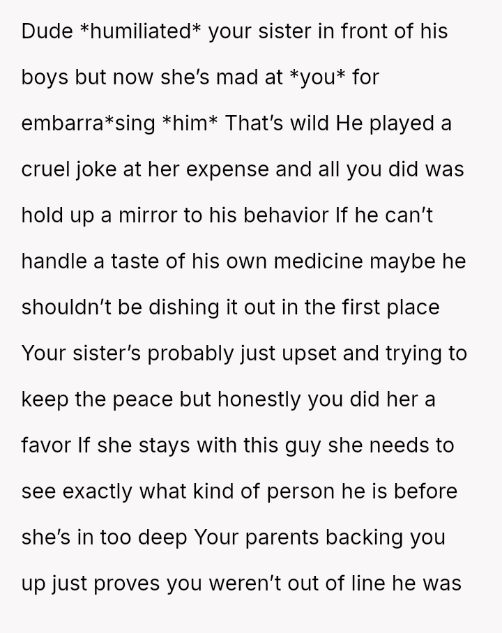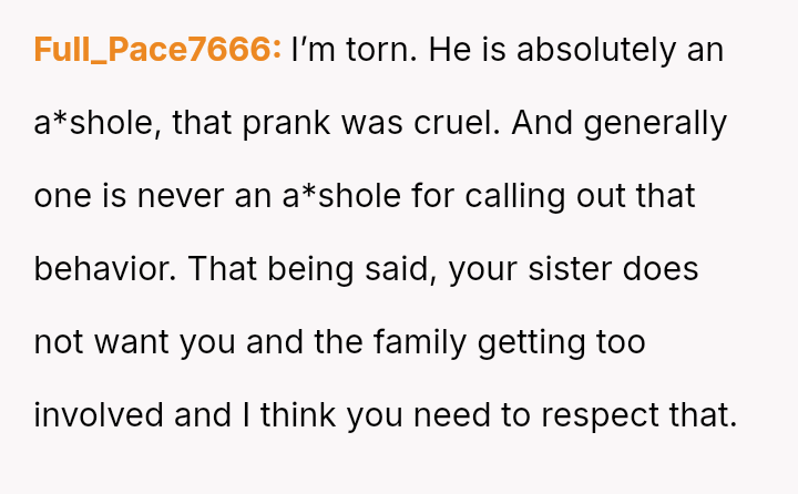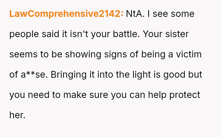 However, the sister is upset, feeling that the intervention publicly embarra*sed the fiancé and potentially worsened her relationship situation.