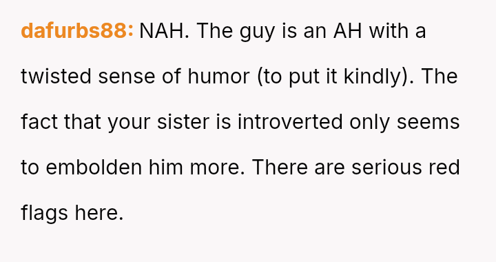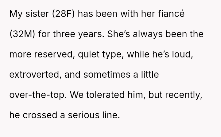 A person describes a situation involving their sister (28F) and her fiancé (32M), who is generally loud and extroverted compared to the sister's reserved nature.
