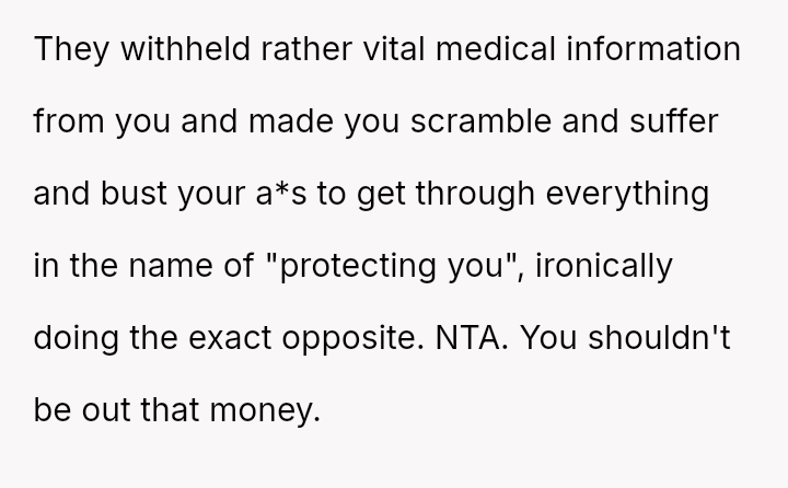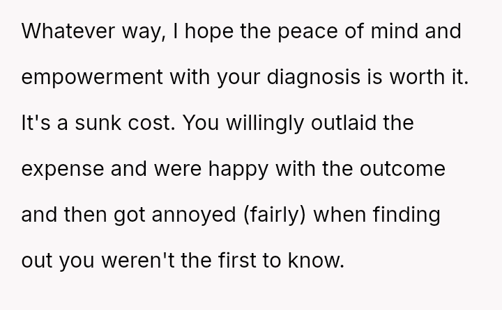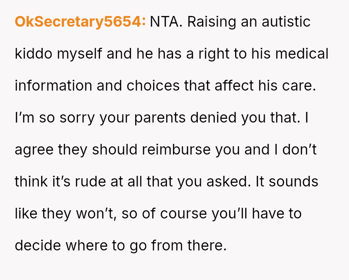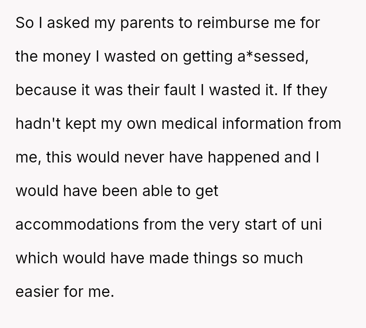 Is the OP justified in demanding financial reimburs**ent from their parents for the $2300 a*sessment fee, given that the parents' decision to conceal prior diagnoses led directly to the OP incurring unnecessary medical expenses later in life, or do the parents' intentions to 'protect' the child override the OP's right to financial compensation for withheld medical history?