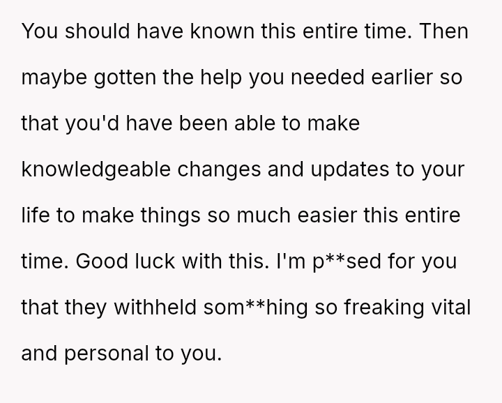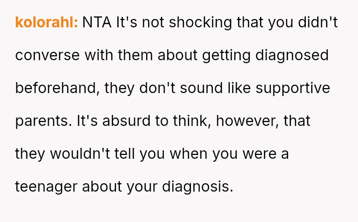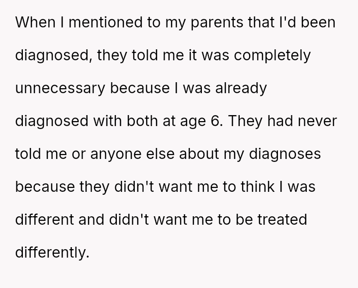 The original poster (OP) is experiencing significant frustration and financial stress because their parents withheld crucial medical diagnoses (autism and ADHD) made in childhood, forcing the OP to incur substantial personal costs for recent re-evaluation.