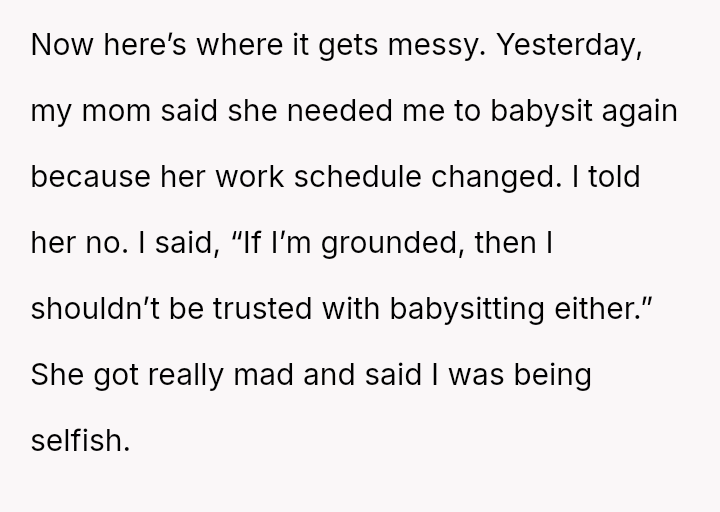 Was the OP justified in refusing the babysitting request as a direct response to being unfairly grounded, or did she cross a line by prioritizing her social desires over a genuine family responsibility, especially given the family's strained circumstances?