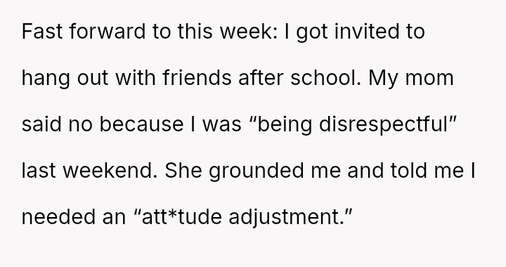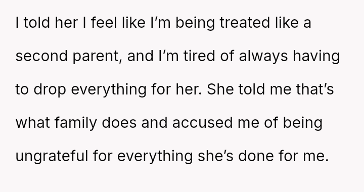 The central conflict arises when the mother enforces strict control and demands compliance based on perceived past disrespect, directly conflicting with the OP's attempt to set boundaries against constant, last-minute caregiving expectations.
