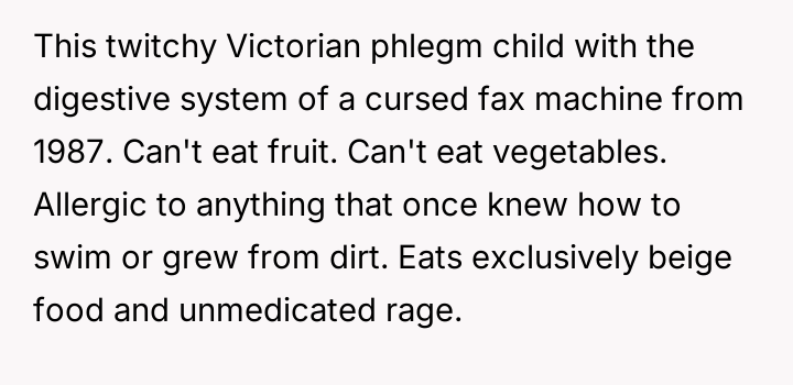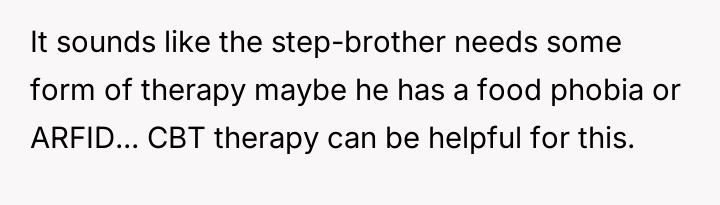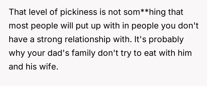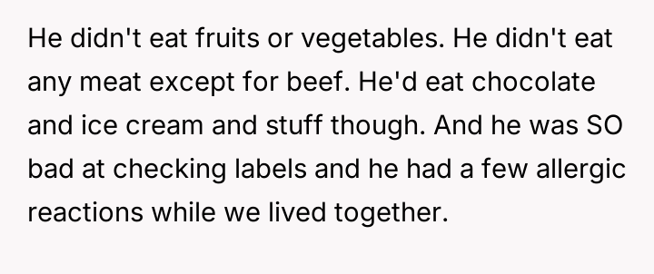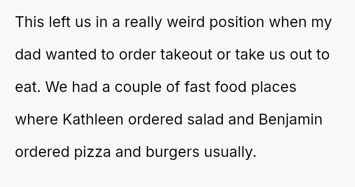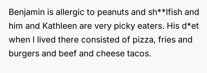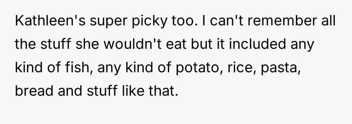 His stepmother, Kathleen, is also very particular, avoiding foods like fish, potatoes, rice, pasta, and bread.