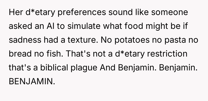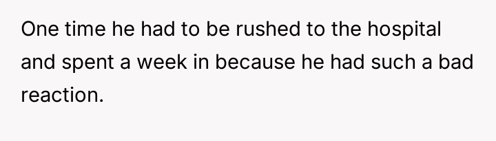 Benjamin has severe allergies to peanuts and sh**lfish and is extremely picky, with a d*et consisting mainly of pizza, fries, burgers, and beef tacos, avoiding most fruits, vegetables, and other meats.