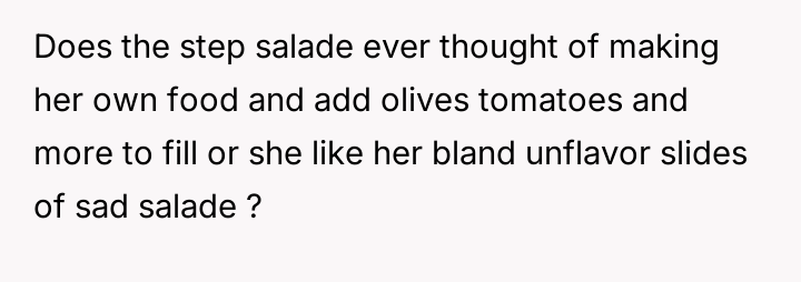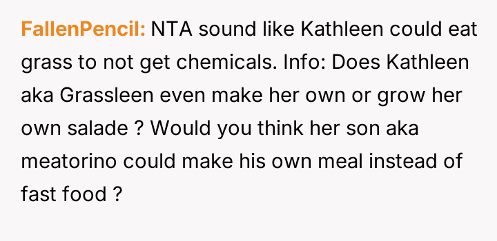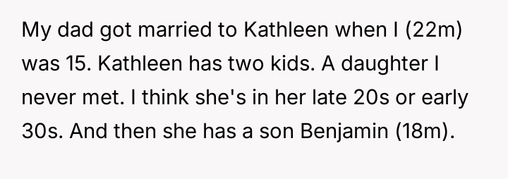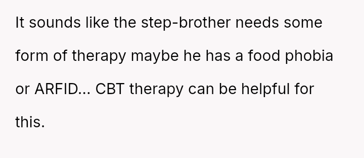 The 22-year-old male poster (OP) describes the complicated eating habits of his stepmother, Kathleen, and her son, Benjamin (18m), who live with his father.