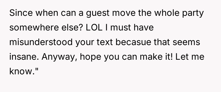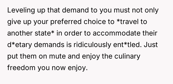The OP agreed only if they could eat at the chosen location, which they refused, demanding the entire party travel out of state to accommodate their preferences, leading the OP to stand his ground and question if he is in the wrong.