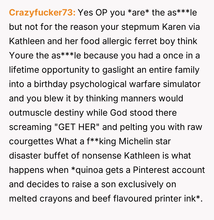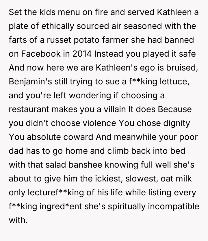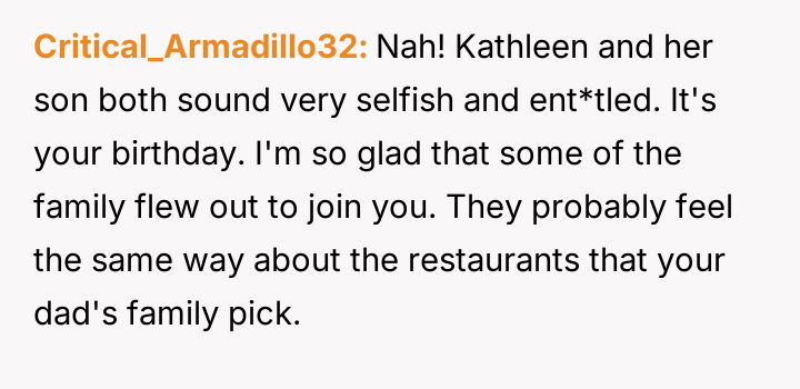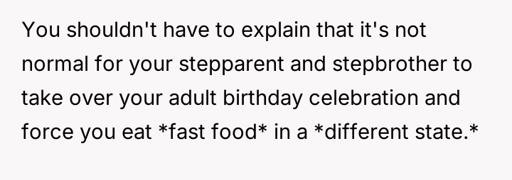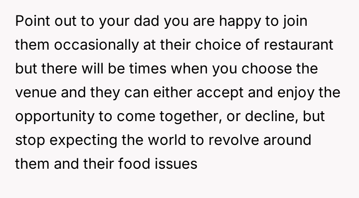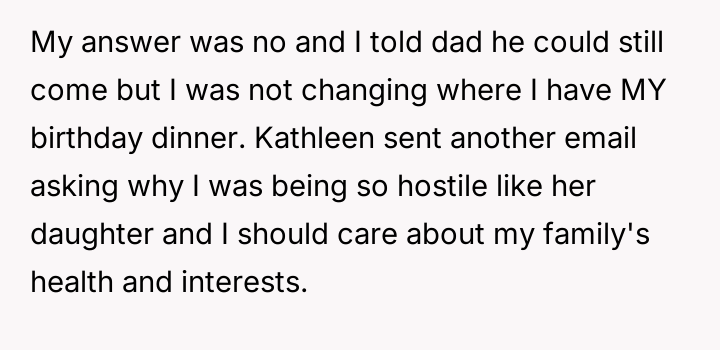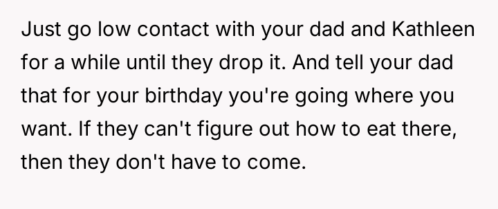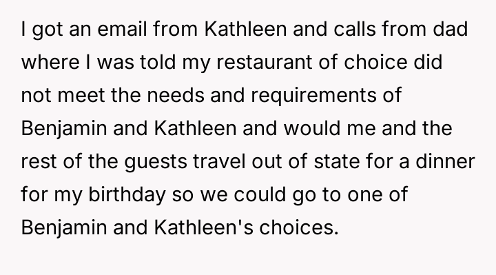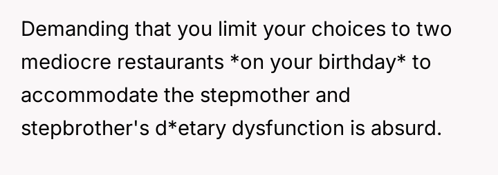 AITA for picking a restaurant for my birthday dinner that "did not meet the needs and requirements" of my dad's wife and her son?