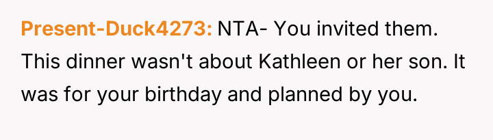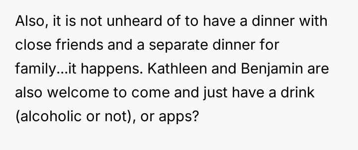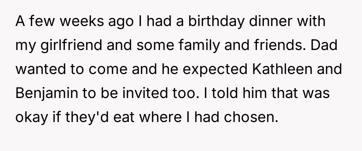 When the OP planned his recent birthday dinner at a restaurant of his choice, his father insisted that Kathleen and Benjamin be invited.