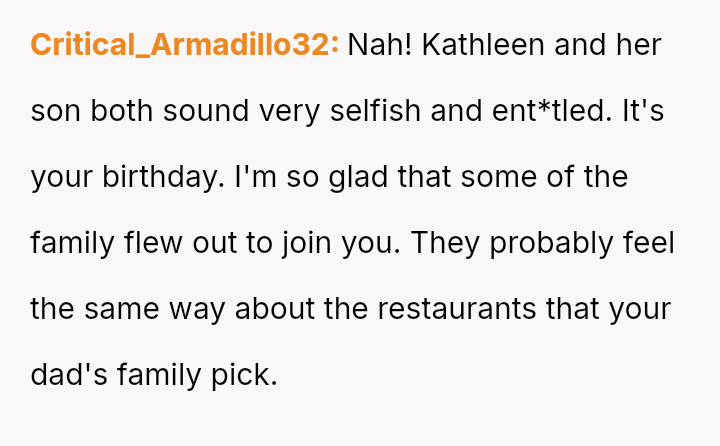 The OP feels frustrated by years of having his celebrations dictated by others' extreme d*etary limitations and reacted by drawing a firm boundary for his own special occasion, resulting in conflict with his father and Kathleen.