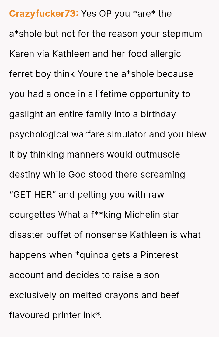 The central conflict revolves around the OP's desire to celebrate his birthday on his own terms versus the strong expectations and perceived needs of his stepmother and stepbrother regarding food accommodations.