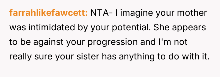The original poster (OP) feels that their mother actively limited their educational opportunities from a young age to protect the feelings and relative standing of their older sister, who has learning disabilities.