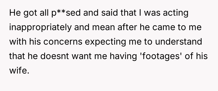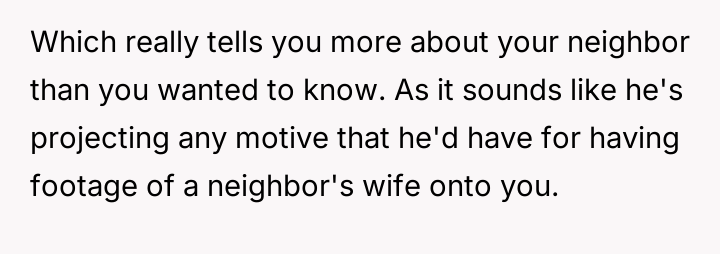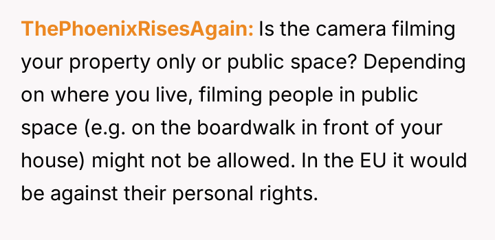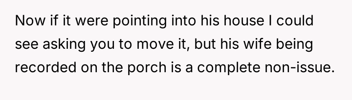 However, this necessary action has created a direct conflict with the neighbor, who feels that the recording of his wife, even incidentally, is an unacceptable invasion of privacy, leading to a breakdown in neighborly relations.