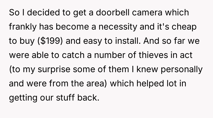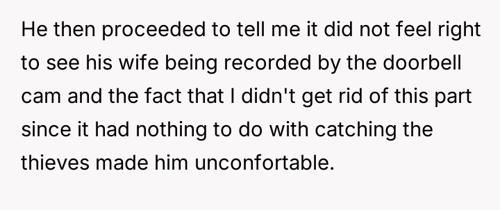 The original poster (OP) acted out of a clear need for personal security following local burglaries, justifying the doorbell camera as a necessary tool for protection and recovery of property.