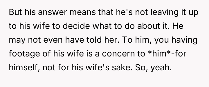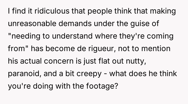 Given the OP's right to security and the neighbor's strong feelings about privacy regarding his spouse, is the neighbor justified in demanding the camera be removed or modified, or does the OP's right to self-protection supersede the neighbor's discomfort with being incidentally recorded for a legitimate security purpose?