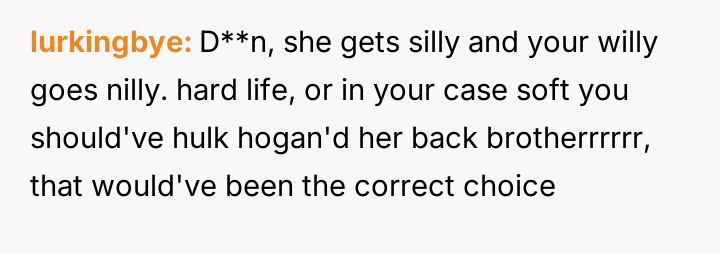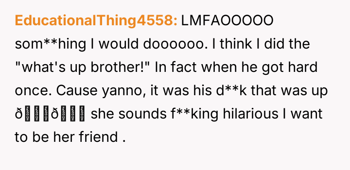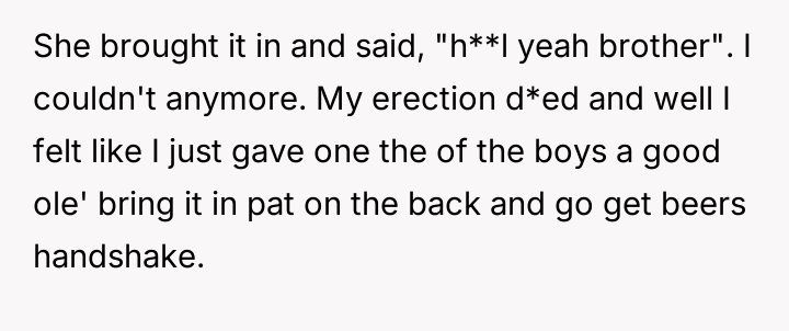 She unexpectedly grasped his hand and pulled it toward her in a movement resembling a friendly handshake, saying, "h**l yeah brother." This action immediately stopped the narrator's arousal, causing his erection to subside, leaving him feeling as though he had just shared a casual, platonic gesture with a friend. The narrator is now seeking an outlet to discuss this confusing and deflating experience.