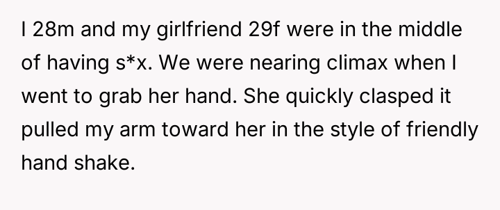 The narrator, a 28-year-old male, and his 29-year-old girlfriend were engaged in s*xual activity. As they approached climax, the narrator reached for his girlfriend's hand.