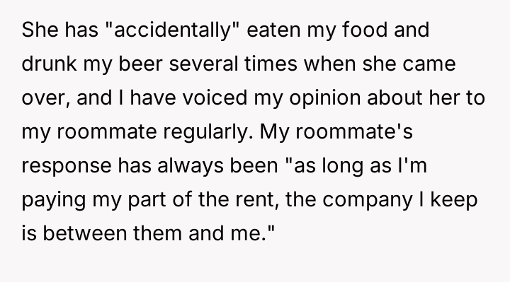 The central conflict pits the OP's right to a safe and private home against the roommate's belief that her tenancy rights protect her choice of guests, regardless of their behavior.
