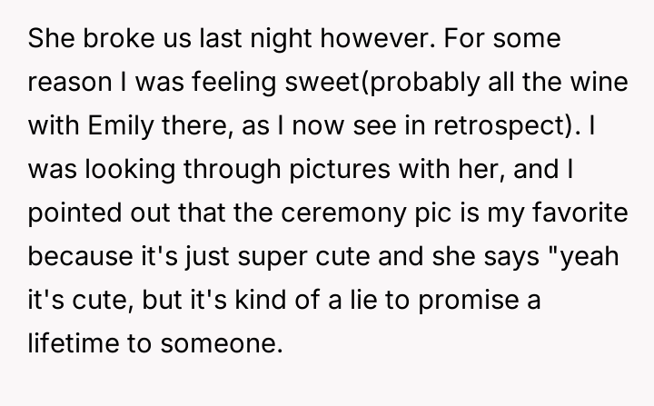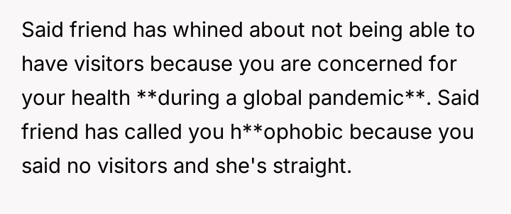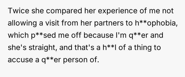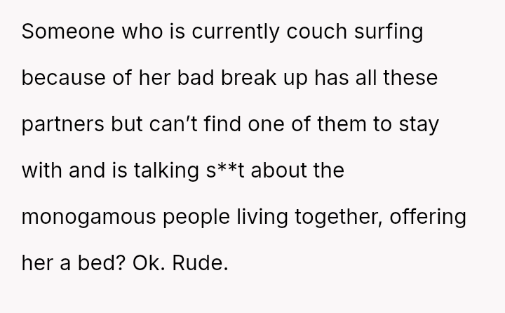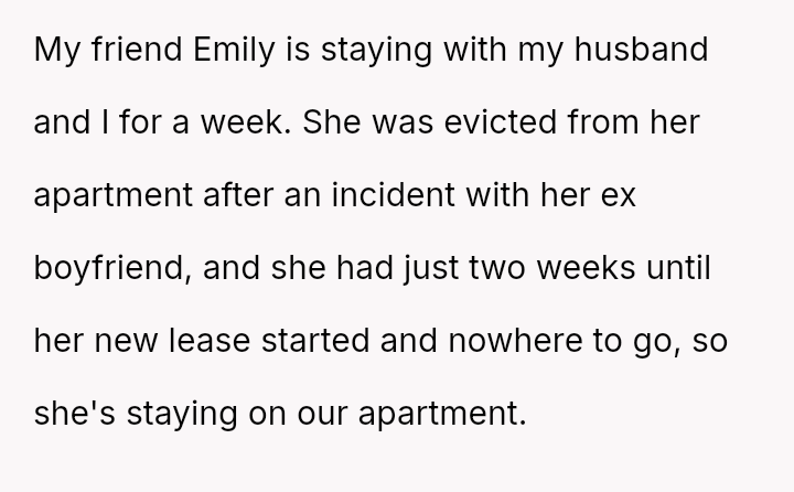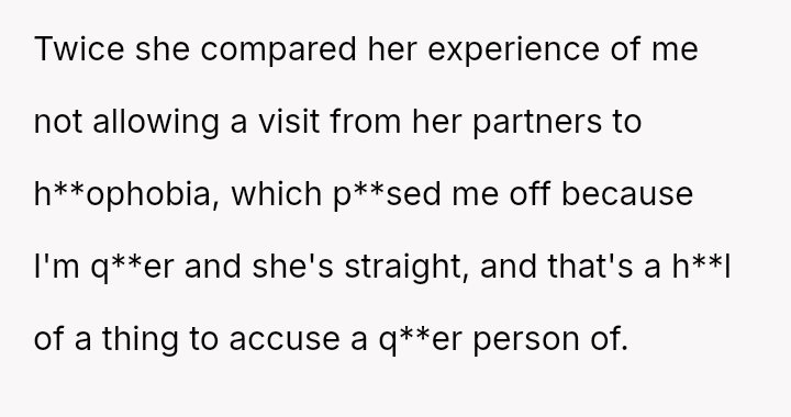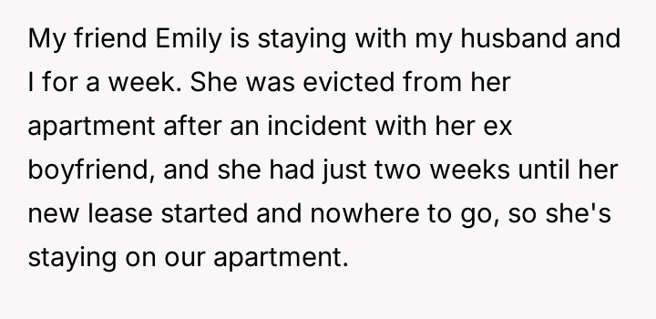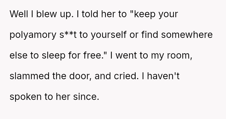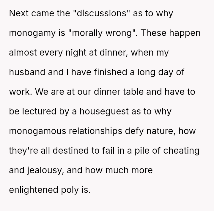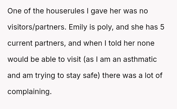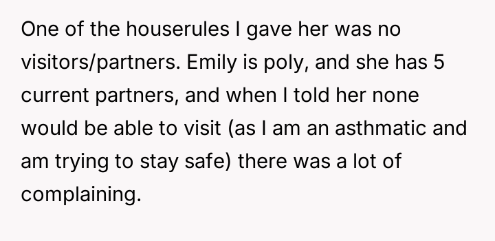 The original poster (OP) is experiencing significant distress due to their houseguest, Emily, repeatedly v***ating stated house rules and aggressively challenging the OP's personal life choices, specifically their monogamous marriage.