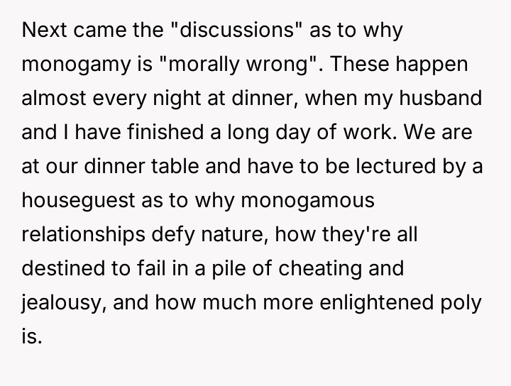 AITA for telling my friend to "keep her polyamory s**t to herself" or leave my home?
