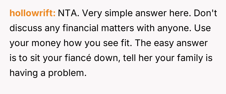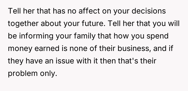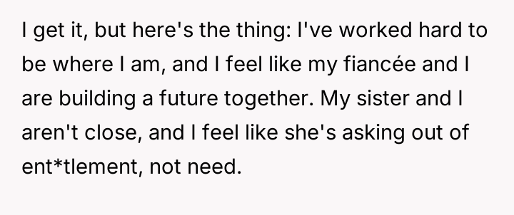 His current actions prioritize his future with his fiancée, which directly clashes with his sister's and parents' expectations that he provide equal support to all family members based on past hardship.