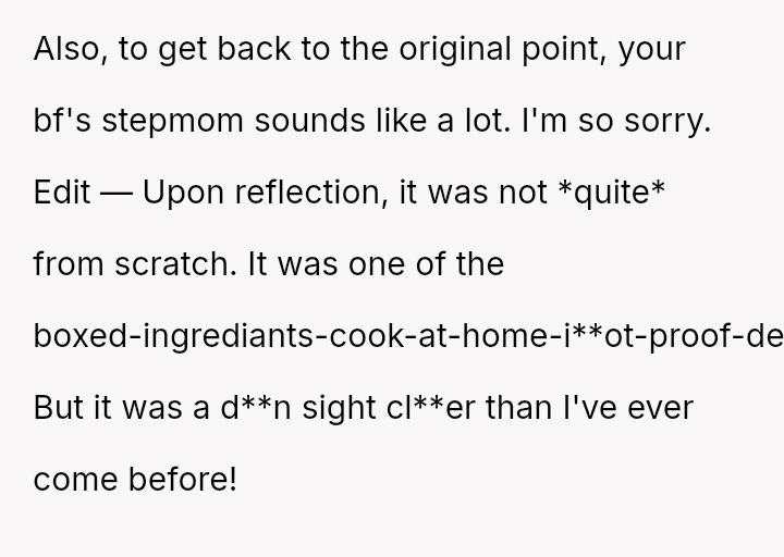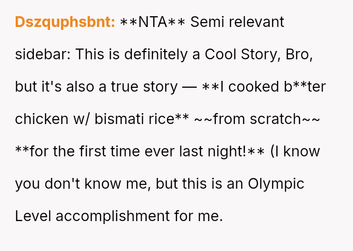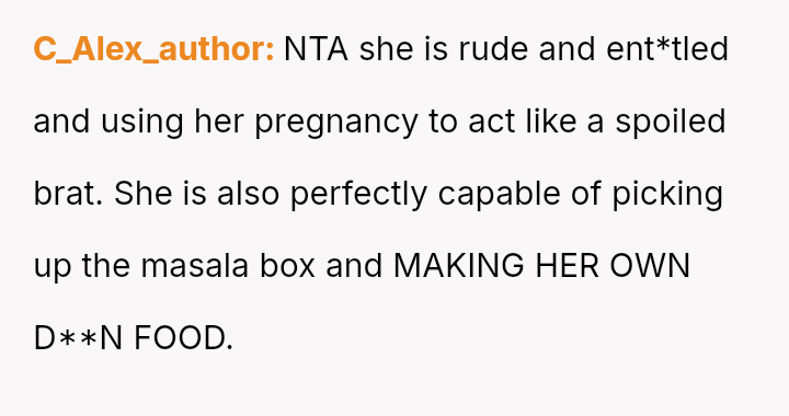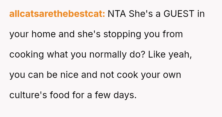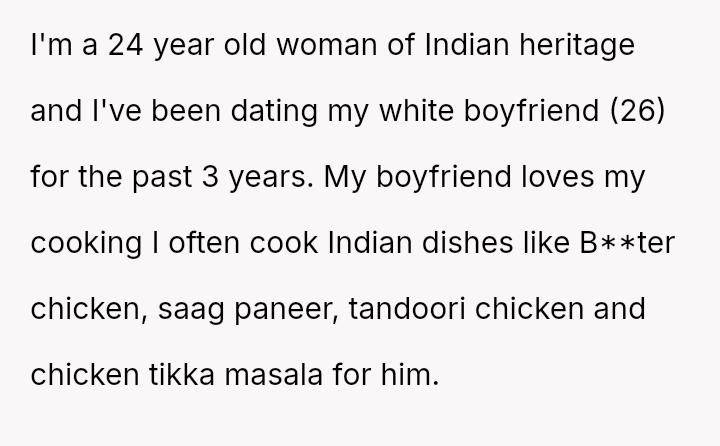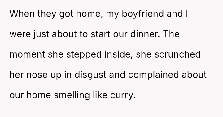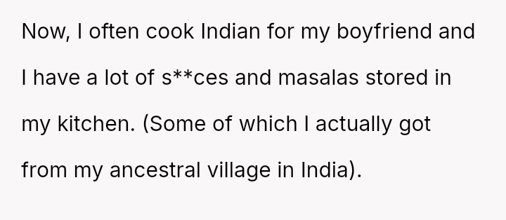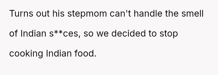 The central conflict arises when the stepmother's strong aversion to the smell of Indian s**ces forces the OP to stop cooking familiar food, leading to a tense confrontation when the OP a*serts her right to cook for herself and her boyfriend.