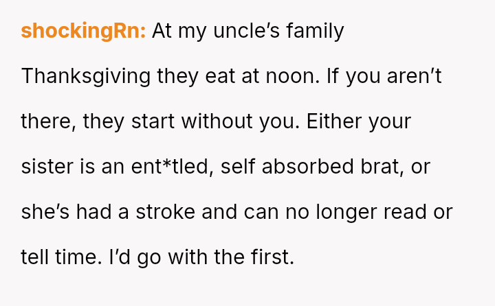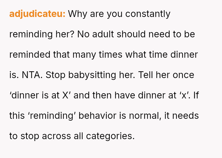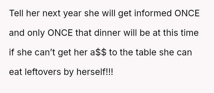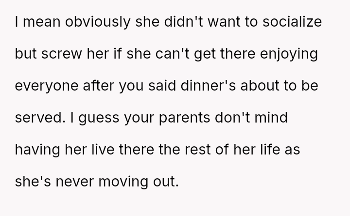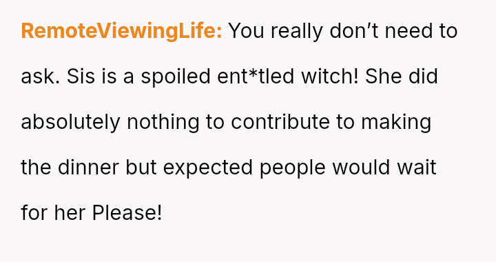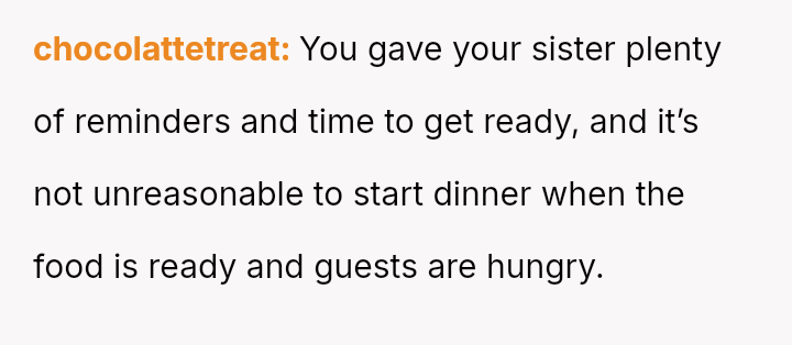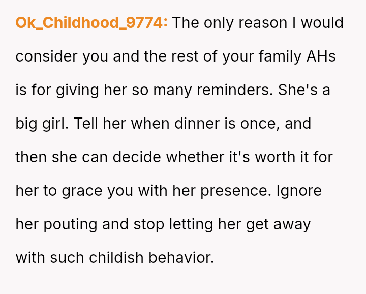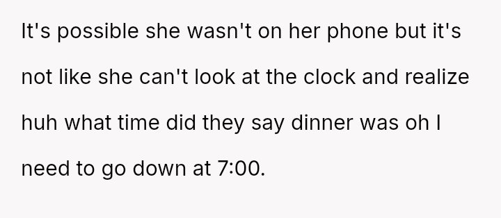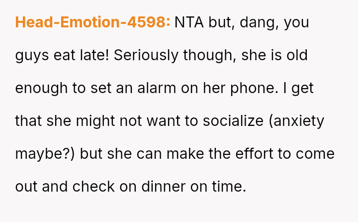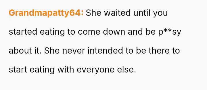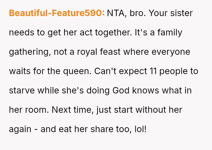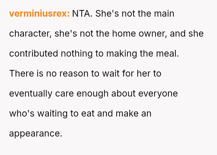 After the meal began, this person eventually came downstairs upset that everyone had started eating without them, leading the OP to question whether they were in the wrong for proceeding.