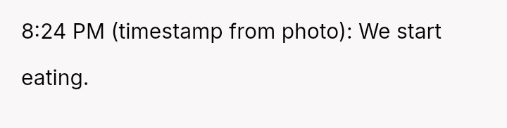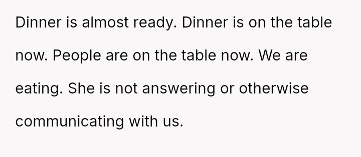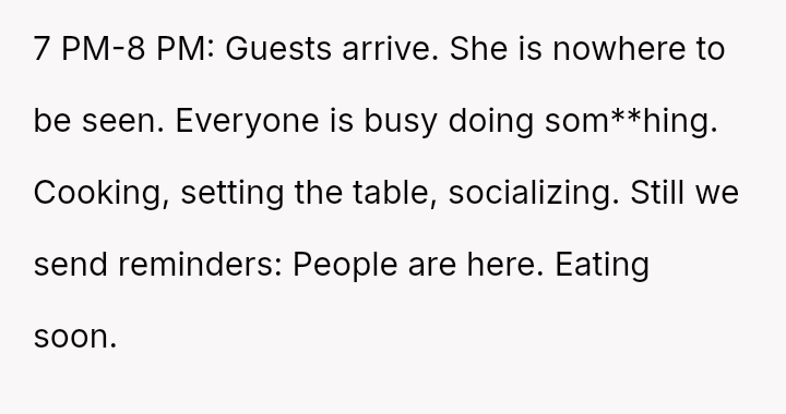 Despite repeated reminders sent between 1 PM and 7 PM, the individual remained absent when the guests arrived and dinner was served around 8:24 PM.