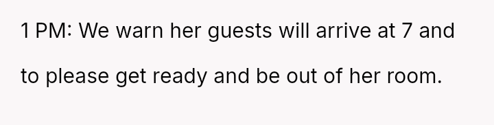 Leading up to the event, the couple informed a specific individual that guests were arriving at 7 PM and that this person needed to be ready and out of their room by that time.