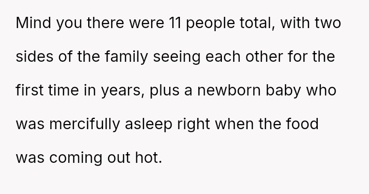 The original poster (OP) and their partner were hosting a significant family dinner involving eleven people, including relatives who had not seen each other in years and a newborn baby.