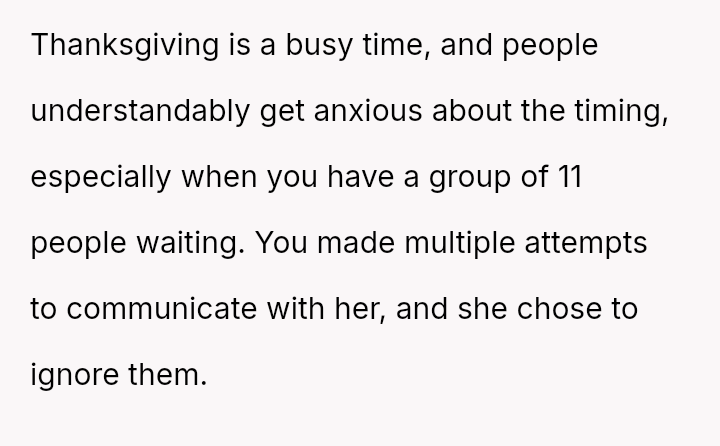 The OP feels justified in prioritizing the needs and hunger of eleven other guests, especially given the circumstances involving family reunion and a baby, while the other party appears upset about being excluded from the start of the meal.